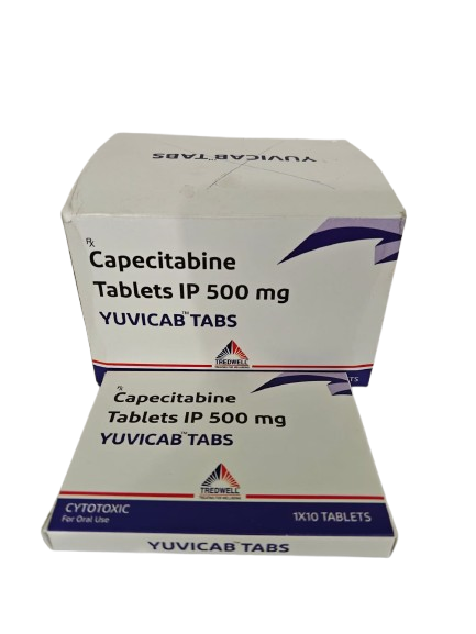 YUVICAB Tablets contain Capecitabine IP 500 mg, an oral chemotherapy medication prescribed for specific types of cancer as part of a treatment plan determined by a qualified oncologist.